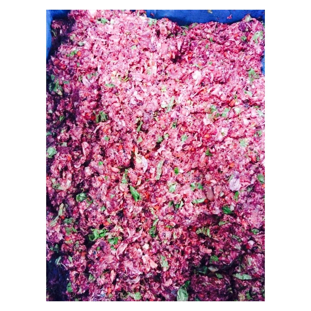 50 % mleté kuřecí maso, kůže a šlachy, 30 % mletých kuřecích kostí, 10 % mletých kuřecích drobů, 10 % zelenina - mkev, červ. řepa a zelený salát