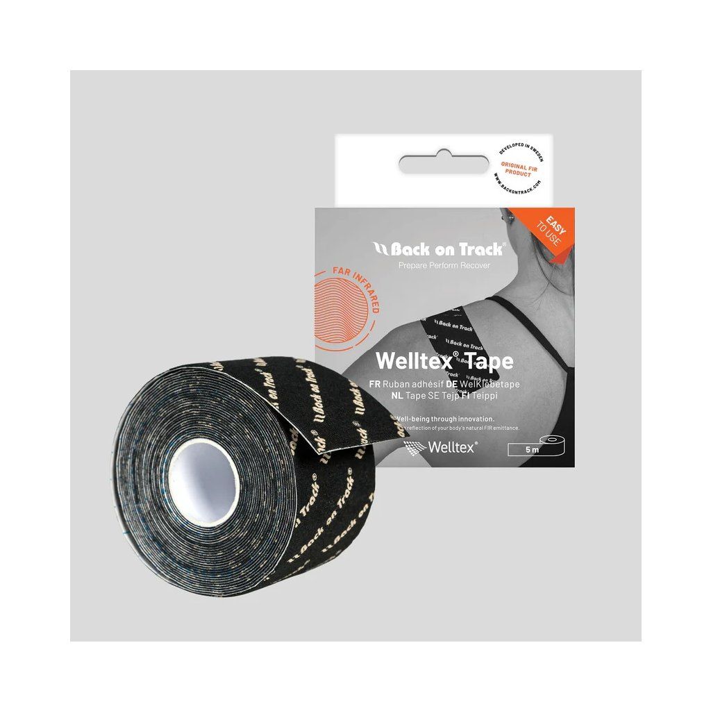 Back on Track Welltex® Tape: Profesionální regenerace v jedné roli. Terapeutický kinesiotejp s patentovanou technologií Welltex®, který kombinuje mechanickou podporu svalů s infračerveným prohříváním. Integrované keramické částice stimulují krevní oběh a urychlují hojení tkání. Role o délce 5 metrů umožňuje individuální zastřižení podle potřeby. Vysoce elastický, prodyšný a voděodolný pomocník pro úlevu od bolesti a zvýšení sportovního výkonu.