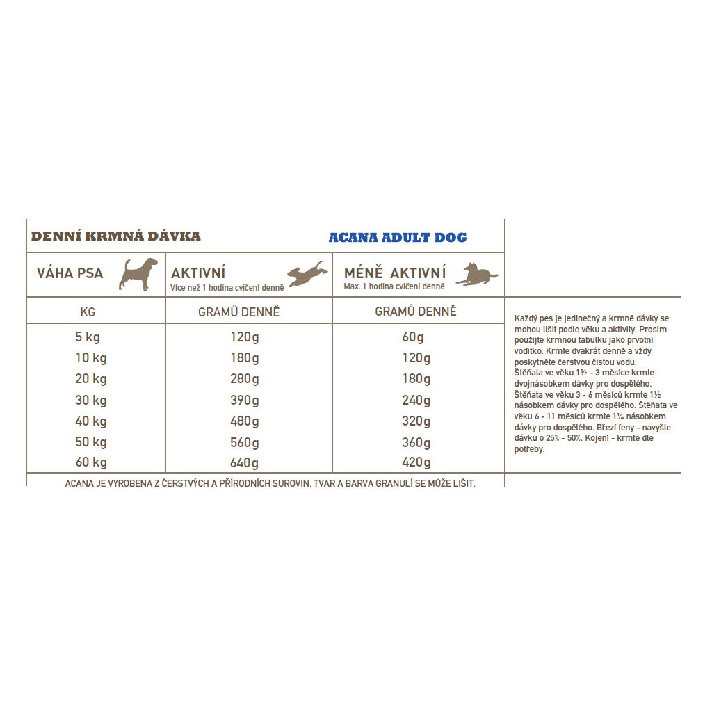 PŘIPRAVOVÁNO V NAŠICH OCEŇOVANÝCH KUCHYNÍCH V KANADĚ. ACANA ADULT PŘEKYPUJE ČERSTVÝMI MÍSTNÍMI SUROVINAMI VČETNĚ VOLNĚ CHOVANÝCH KUŘAT, VAJEC Z HNÍZDNÍCH CHOVŮ, PLATÝSE LOVENÉHO VOLNĚ V PŘÍRODĚ A NA SLUNCI ZRAJÍCÍHO OVOCE A ZELENINY – VŠECHNY SUROVINY DODÁVAJÍ VÝŽIVU A CHUTNOST A ZAJIŠŤUJÍ TAK VRCHOLOVOU KONDICI VAŠEHO PSA. PŘEČTĚTE SI NAŠE SLOŽENÍ A MYSLÍME, ŽE S NÁMI BUDETE SOUHLASIT.