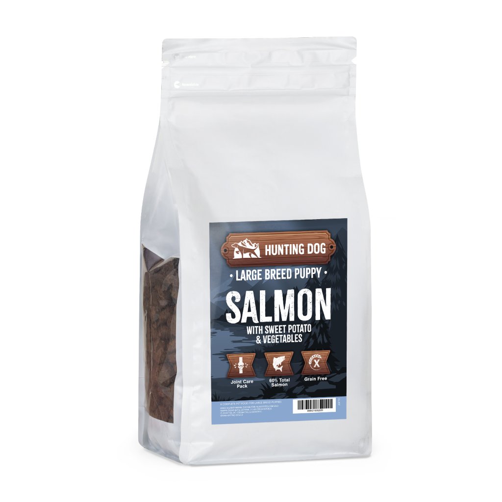 Tato receptura je postavena pro štěňata velkých plemen. Hlavním zdrojem bílkovin je losos, který si díky šetrné přípravě zachovává cenné bílkoviny a dochází také ke zvýšení chutnosti a stravitelnosti. Bohatě se vyskytující omega 3 esenciální mastné kyseliny se podílejí na podpoře kvality kůže, srsti, zdraví kloubů a mají protizánětlivé vlastnosti.