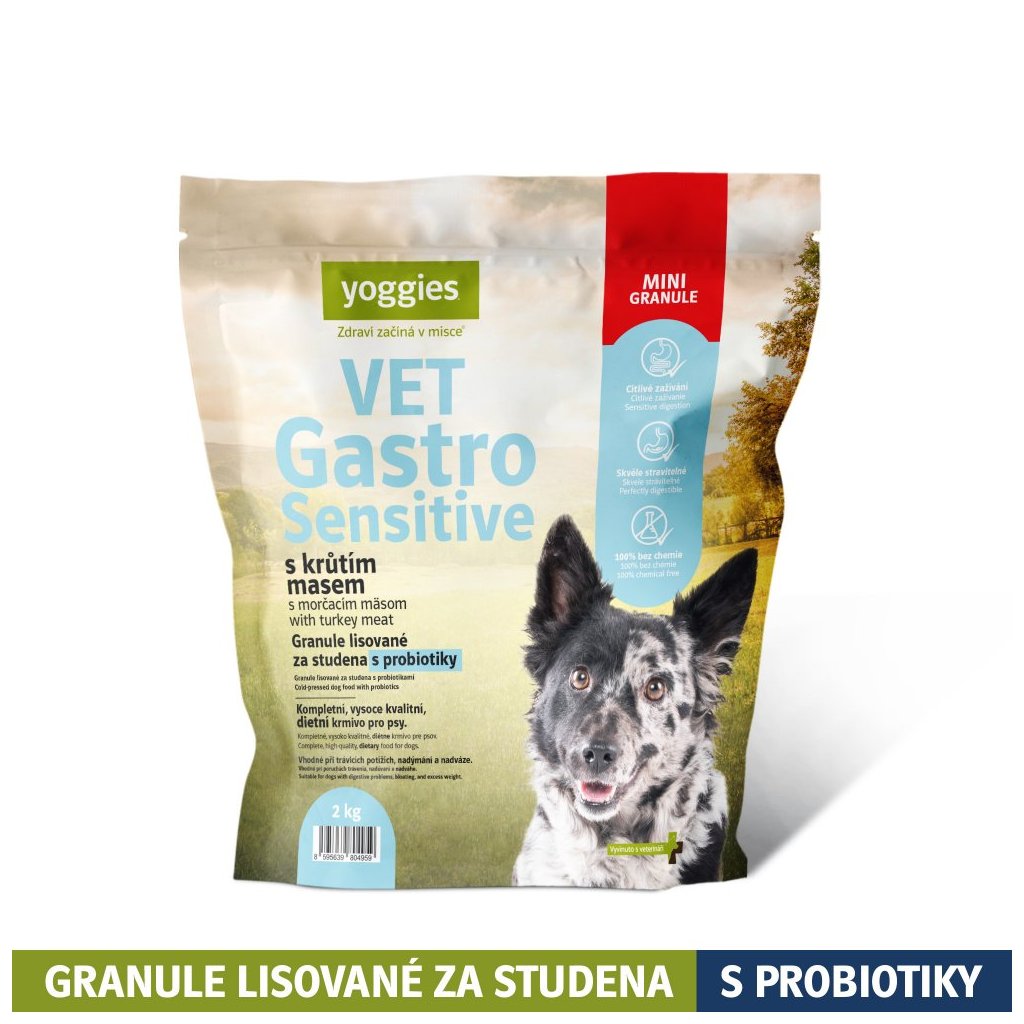 Kompletní krmivo pro psy. Nová řada za studena lisovaných MINIgranulí s probiotiky a bez chemie – Yoggies VET je vyvinuta s veterináři a testovaná u psů se střevními, imunitními i jinými zažívacími problémy a s potravinovými a dalšími alergiemi.