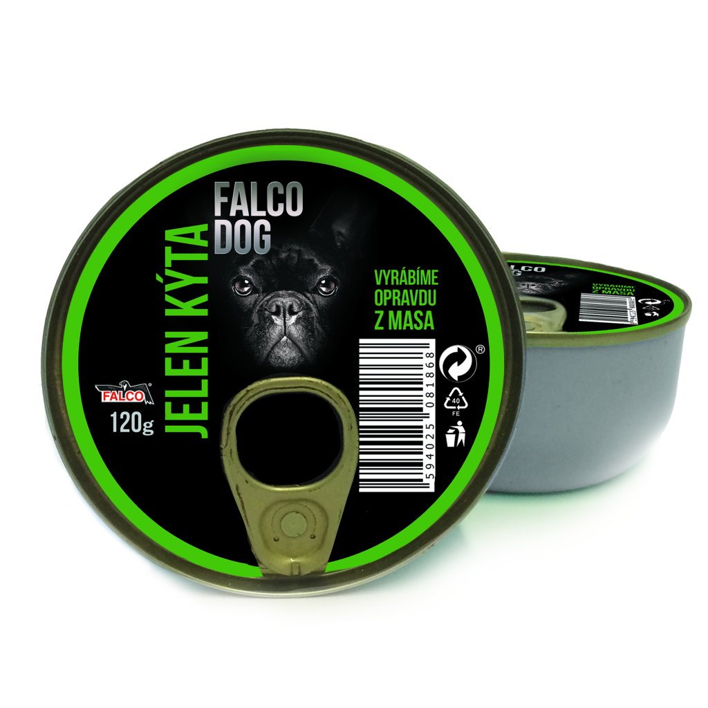 Konzervy jsou ručně plněné a to pouze výběrovou svalovinou bez přídavku rýže, zeleniny nebo brambor. Konzervy pro psy Falco jsou zcela bez barviv, dochucovadel, neobsahují sóju ani chemické látky.