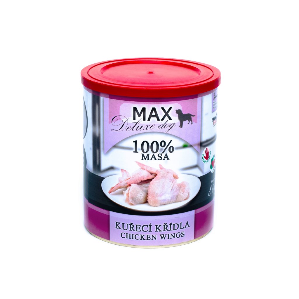 Doplňkové krmivo pro psy. Nejlepší výběr kousků masa. Masová konzerva je naplněna ze 100 % nasekanými kuřecími křídly včetně kostí.