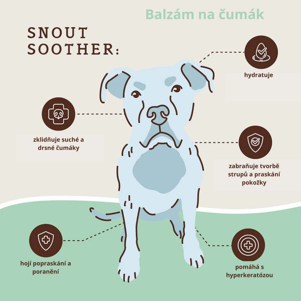 Má váš pejsek suchý, popraskaný nebo zarudlý nos? Snout Soother je přírodní balzám, který léčí, hydratuje a chrání i ty nejcitlivější čumáčky. Ideální pro každodenní péči, ale i řešení problémů jako je hyperkeratóza, strupy nebo podráždění.