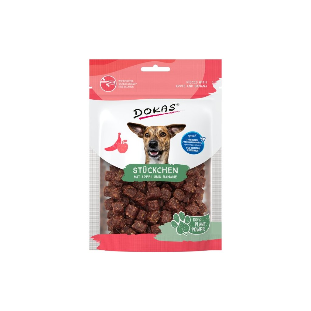 Dokas Kousky s jablkem a banánem 105 g jsou 100% přírodní, poloměkké bezmasé pamlsky pro psy, vyrobené z rostlinných bílkovinných extraktů, ovoce a zeleniny. Jsou ideální pro psy všech věkových kategorií a díky menší velikosti se skvěle hodí pro trénink nebo jako zdravá odměna během dne.
