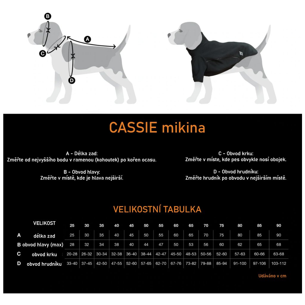 Psí mikina má dobrý střih a snadno se obléká pomocí chytrého zipu uprostřed zad. Zip je uzamykatelný a na vnitřní straně má ochrannou látku, která zabraňuje zasekávání chlupů při otevírání a zavírání. Reflexní detaily a reflexní logo na boku a vepředu poskytují extra bezpečnost ve tmě. Cassie se skvěle hodí i přes zimu, protože částečně zabraňuje usazování sněhu na předních nohách a hrudi - perfektní, pokud jedete v hlubokém sněhu.