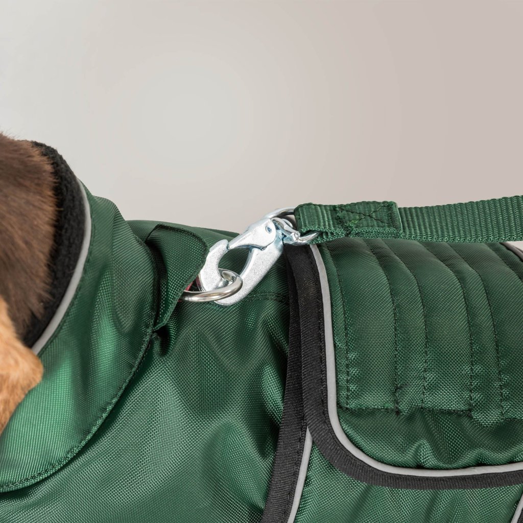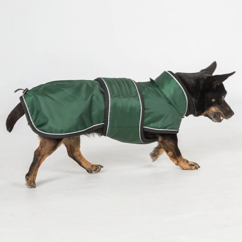 Obleček má vodě a větru odolný povrch. Snadno se obléká a zapíná na široký suchý zip na zádech. Pokud chcete, aby deka přiléhala více k zadním nohám, lze připevnit odnímatelné elastické šňůrky na nohy. U obojku je otvor pro připevnění vodítka k obojku psa. Reflexní detaily činí deku viditelnou ze všech úhlů a poskytují extra bezpečnost při večerní procházce.