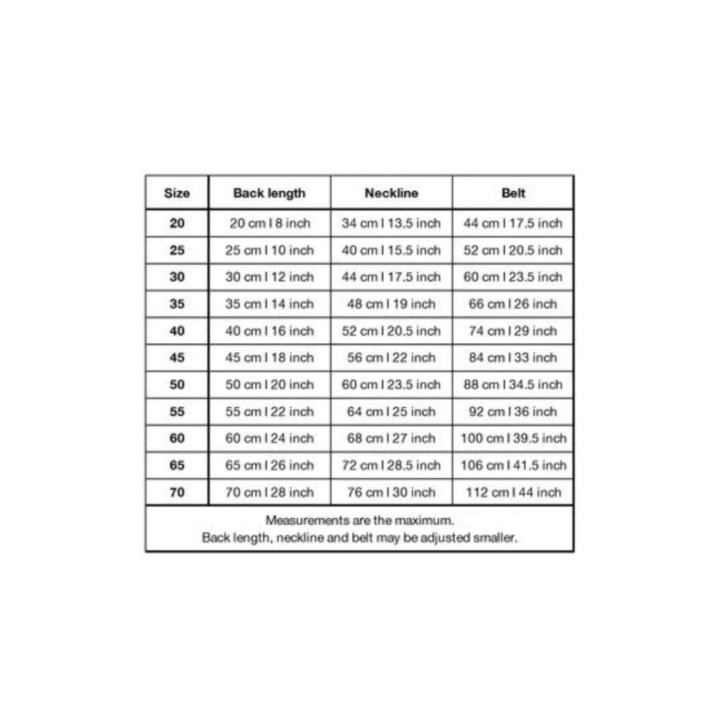 Pro určení celkové velikosti PAIKKA změřte hřbet vašeho psa od krku ke kořeni ocasu. Pokud je váš pes mezi dvěma velikostmi, doporučujeme zvolit větší velikost. Vezměte prosím na vědomí, že míry v tabulce velikostí jsou maximální míry. Obvod krku, hrudníku, gumičky na nohy i délka zad lze zmenšit.
