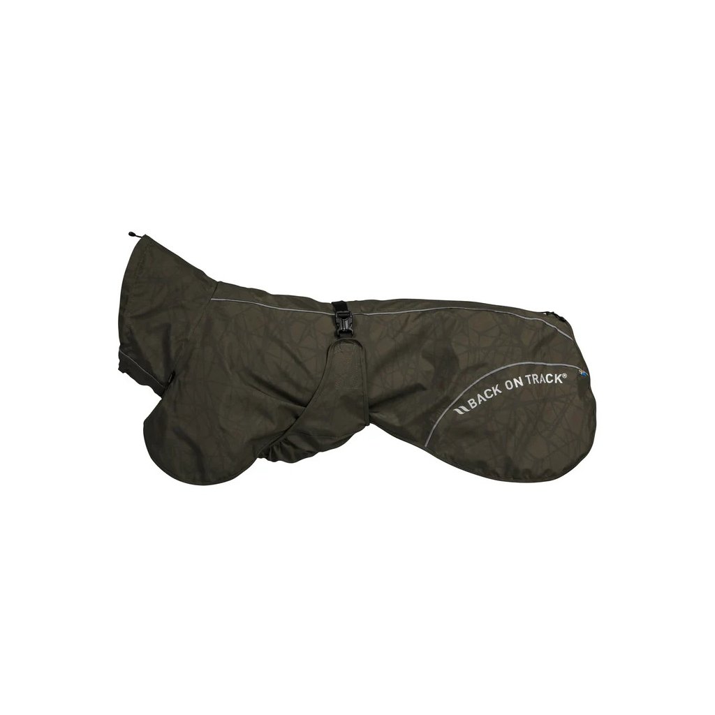 Pláštěnka je anatomicky tvarovaná a díky přiléhavému střihu kolem hrudníku a stehen perfektně obepíná tělo psa, aniž by omezoval jeho přirozený pohyb. Přední díl kabátu umožňuje volnost pro pohyb předních končetin, zatímco zadní část je přizpůsobena psům s vysoko nasazeným ocasem – délku lze snadno upravit pomocí stahovací šňůrky. Elastické popruhy na zadních nohách udržují kabát na místě i při pohybu.