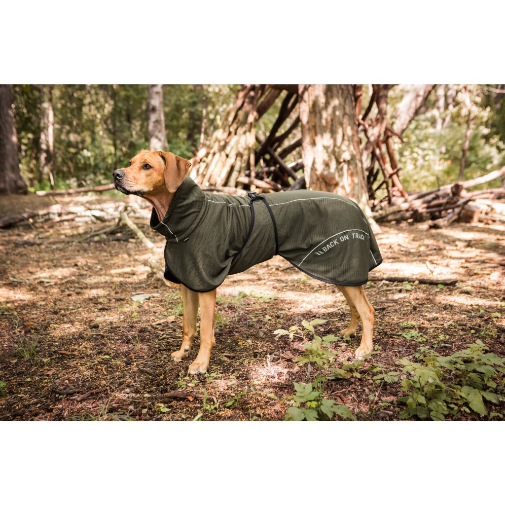 Střih je navržen tak, aby těsně obepínal tělo psa, ale neomezoval v pohybu. Zavinovací konstrukce vpředu i vzadu zajišťuje prostor pro pohyb nohou i ocasu – ideální pro psy s vysoko nasazeným ocasem. Oblast stehen, hrudníku a kořene ocasu je jemně obepnutá pro lepší přilnavost a účinnost látky.