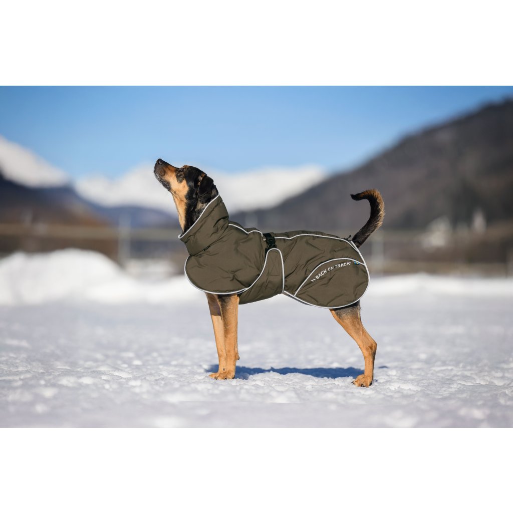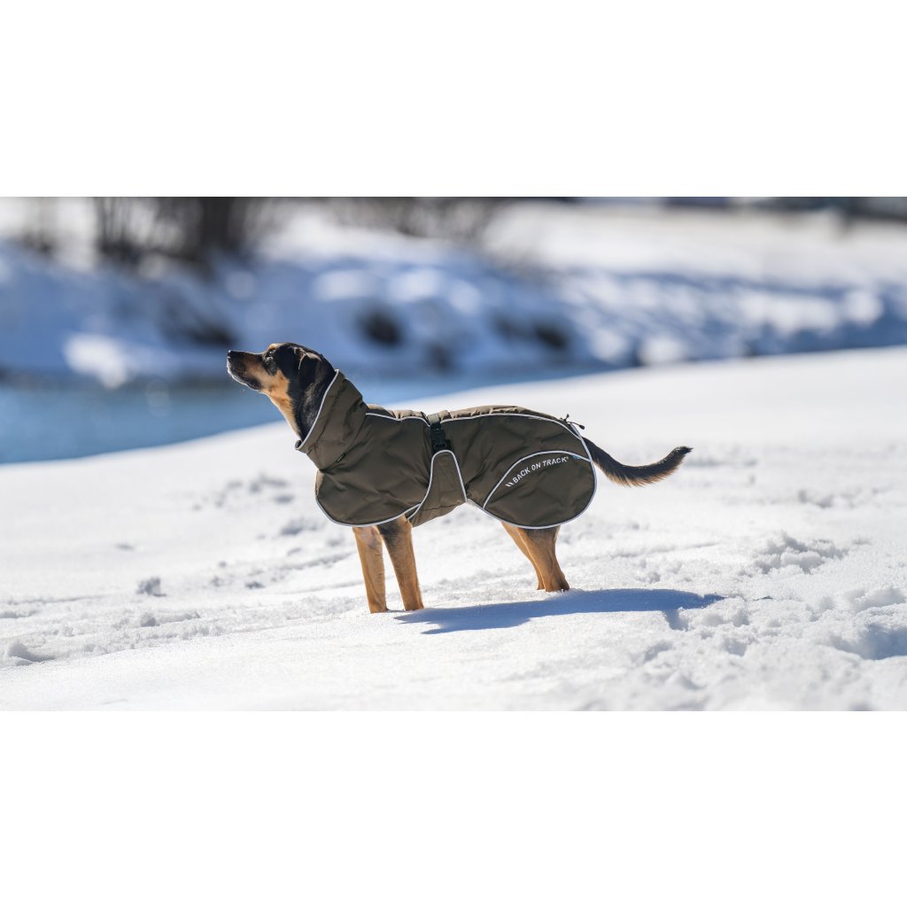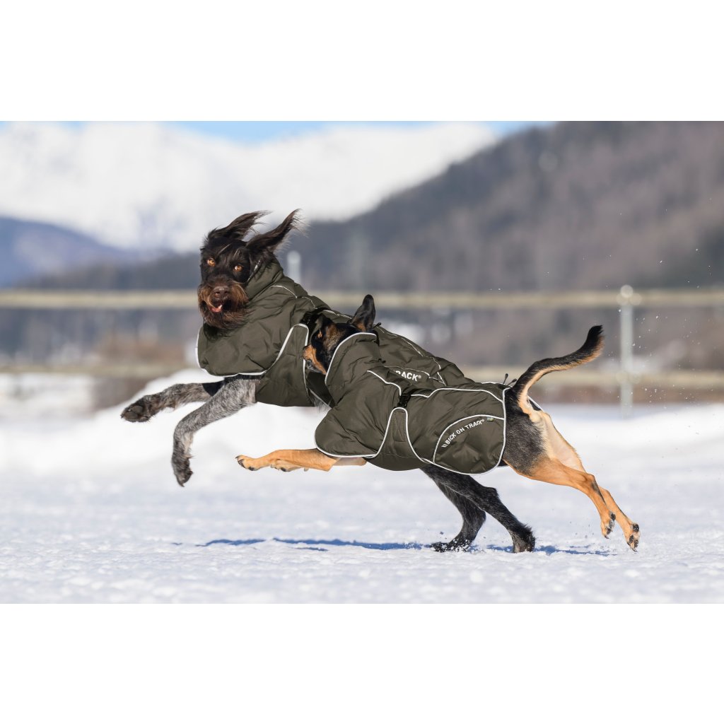 Zimní obleček skvěle padne – obepíná tělo psa, aniž by omezoval pohyb. Přiléhavý střih kolem hrudníku a stehen zajišťuje volnost pohybu při běhu i procházce. Tato verze je speciálně uzpůsobená pro psy s vysoko posazeným ocasem – kabát obepíná jak zadní nohy, tak kořen ocasu, ale zároveň ponechává dostatek prostoru pro jejich přirozený pohyb.