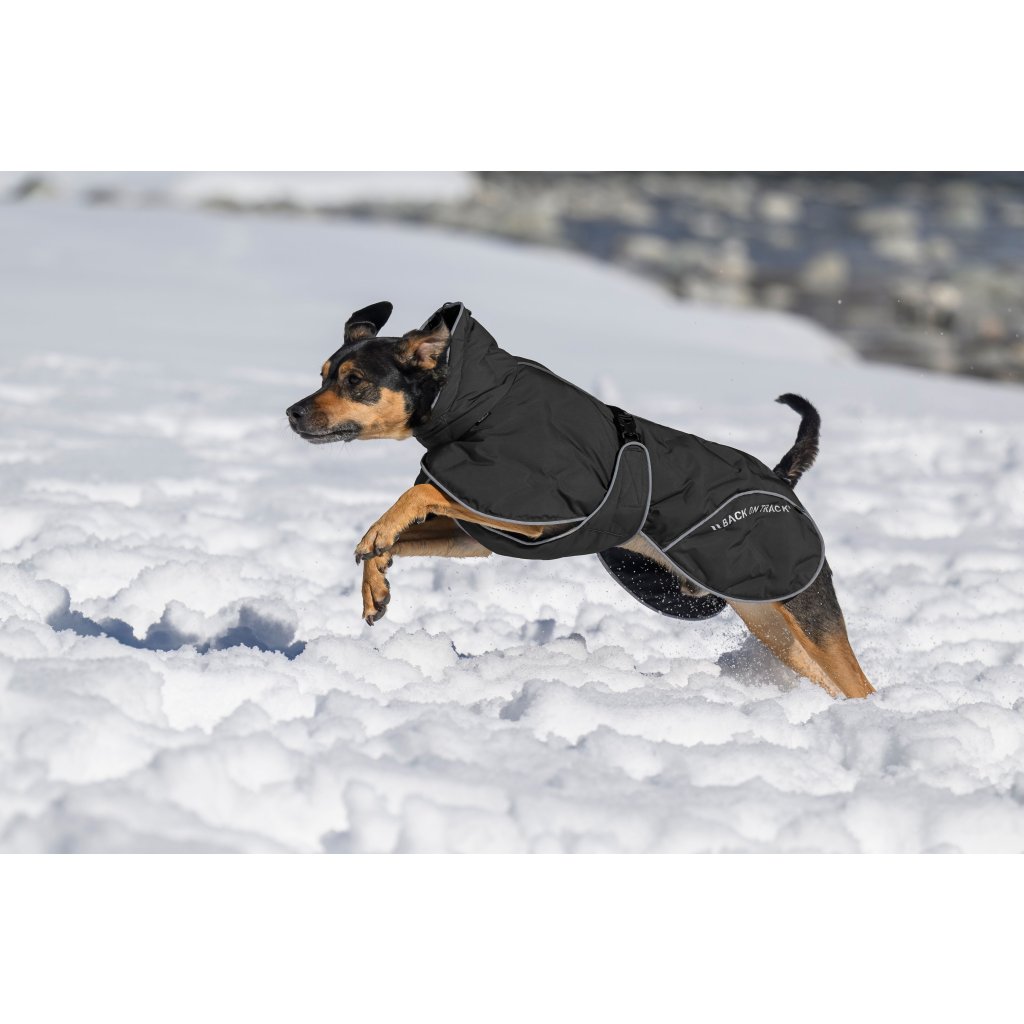 Zimní obleček skvěle padne – obepíná tělo psa, aniž by omezoval pohyb. Přiléhavý střih kolem hrudníku a stehen zajišťuje volnost pohybu při běhu i procházce. Tato verze je speciálně uzpůsobená pro psy s vysoko posazeným ocasem – kabát obepíná jak zadní nohy, tak kořen ocasu, ale zároveň ponechává dostatek prostoru pro jejich přirozený pohyb.